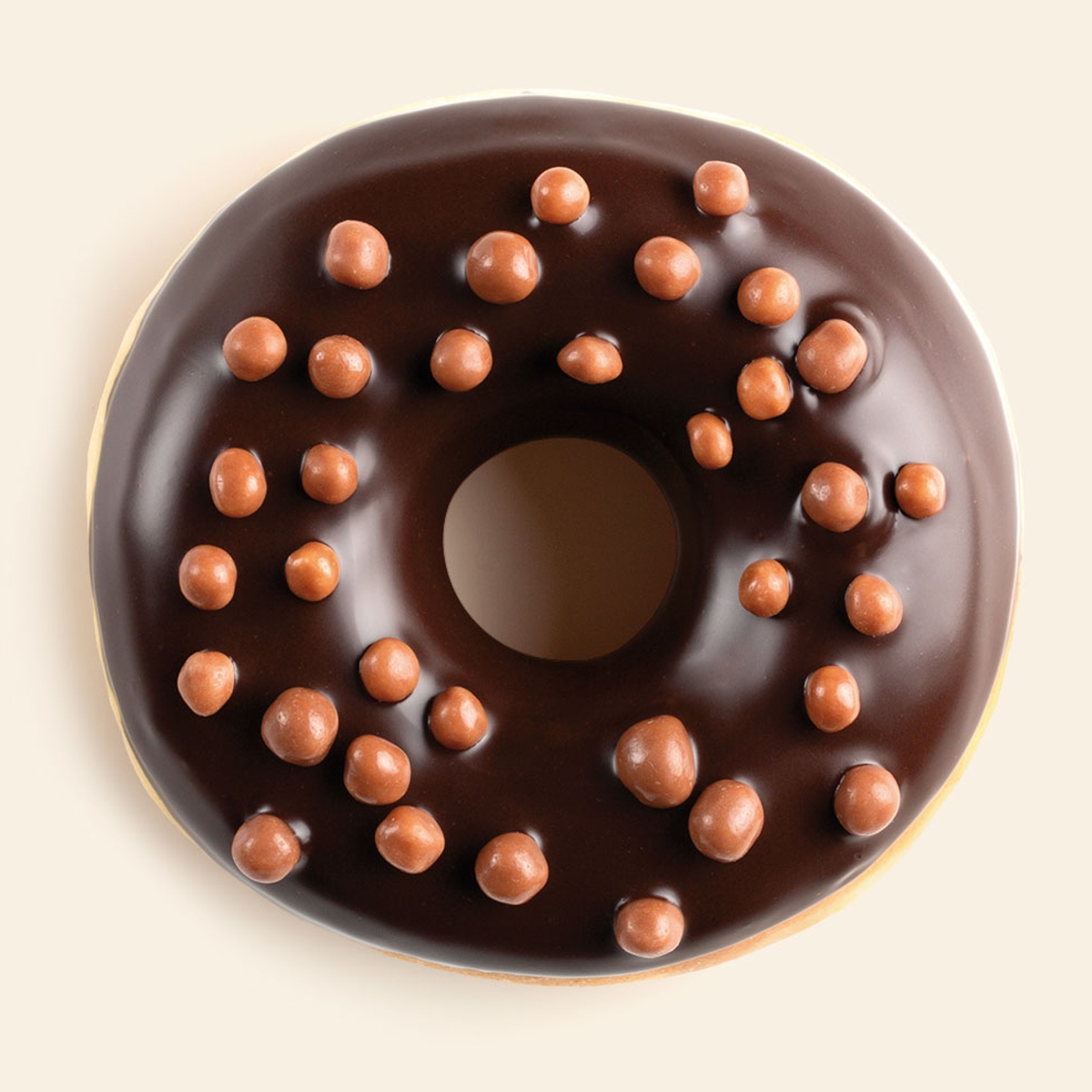 Núcleo de cereais revestido de chocolate de leite com 5mm de diâmetro.