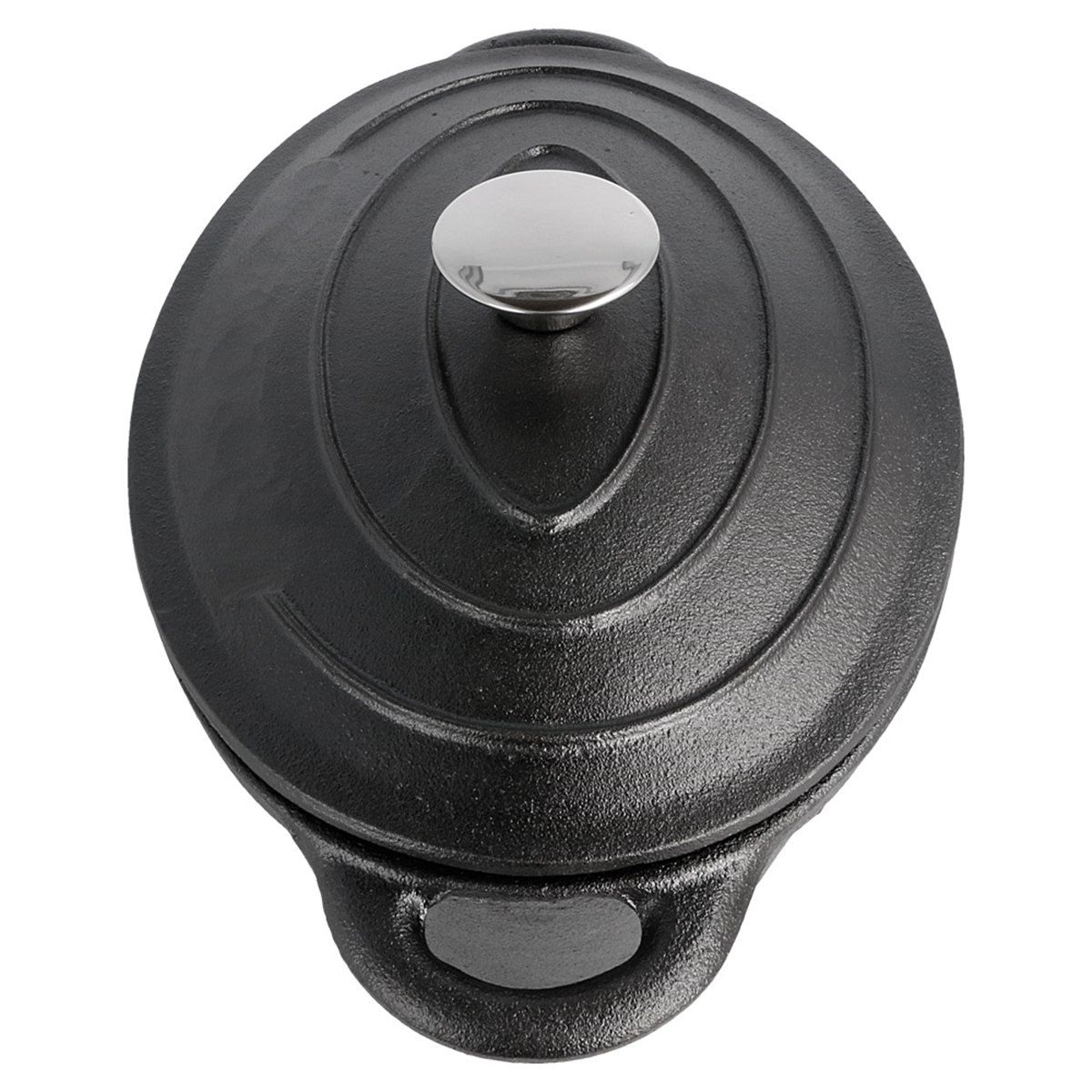 Cocotte oval com tampa de ferro fundido preto.