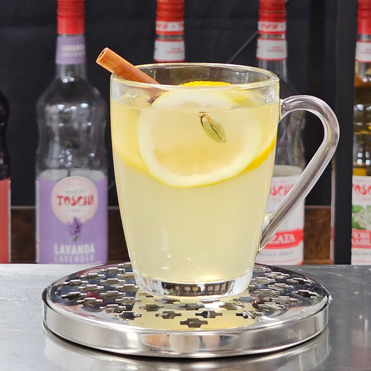 Juntar todos os ingredientes dentro de uma chávena Hot Toddy, preencher com água a ferver e mexer com a colher de bar.
