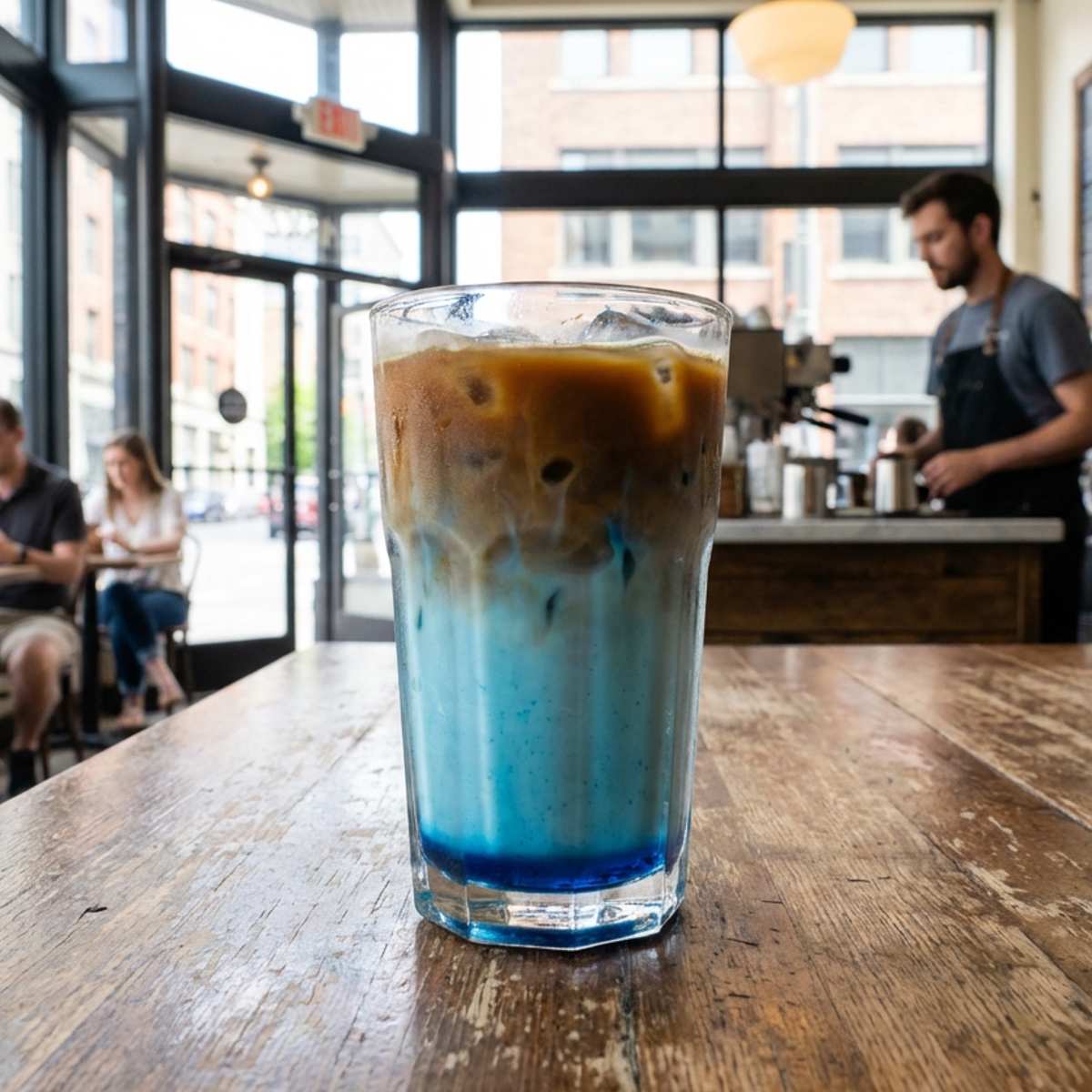Verter o butterfly pea tea por cima do copo com xarope e gelo
