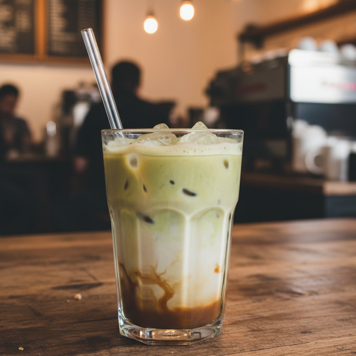 Completar com 30ml de café/matcha, vertendo devagar por cima do leite com o xarope, de modo a obter o efeito degradê