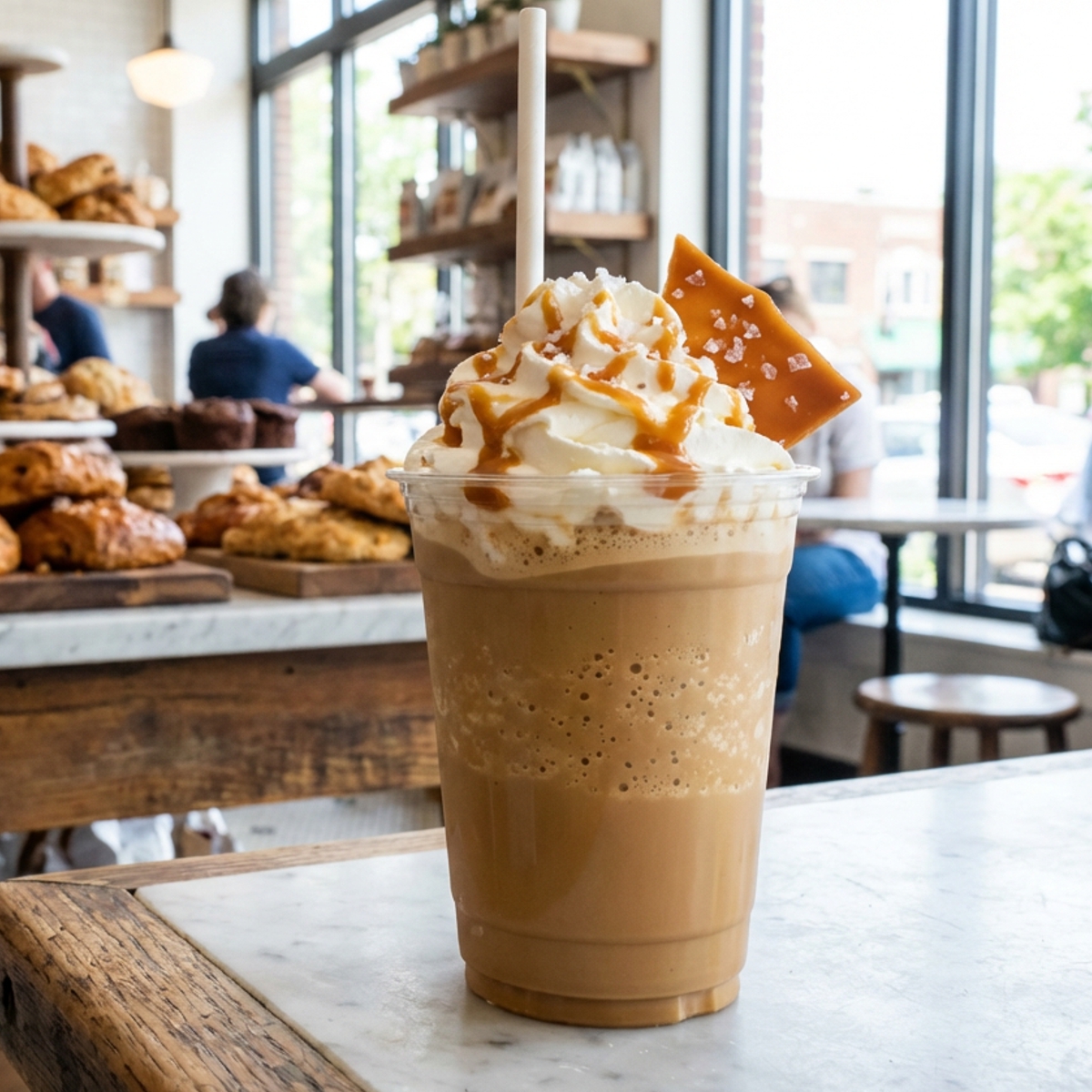 Verter para um copo RPET de 300ml, previamente decorado com o topping de caramelo salgado.
