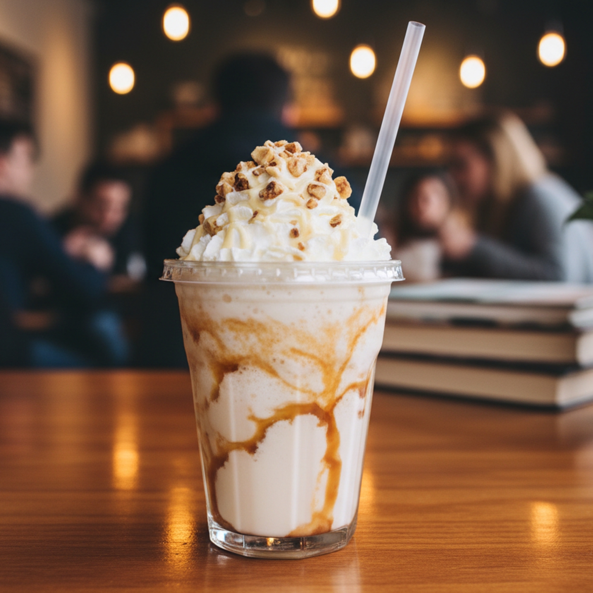 Verter para um copo RPET de 300ml, previamente decorado com o topping de caramelo salgado.