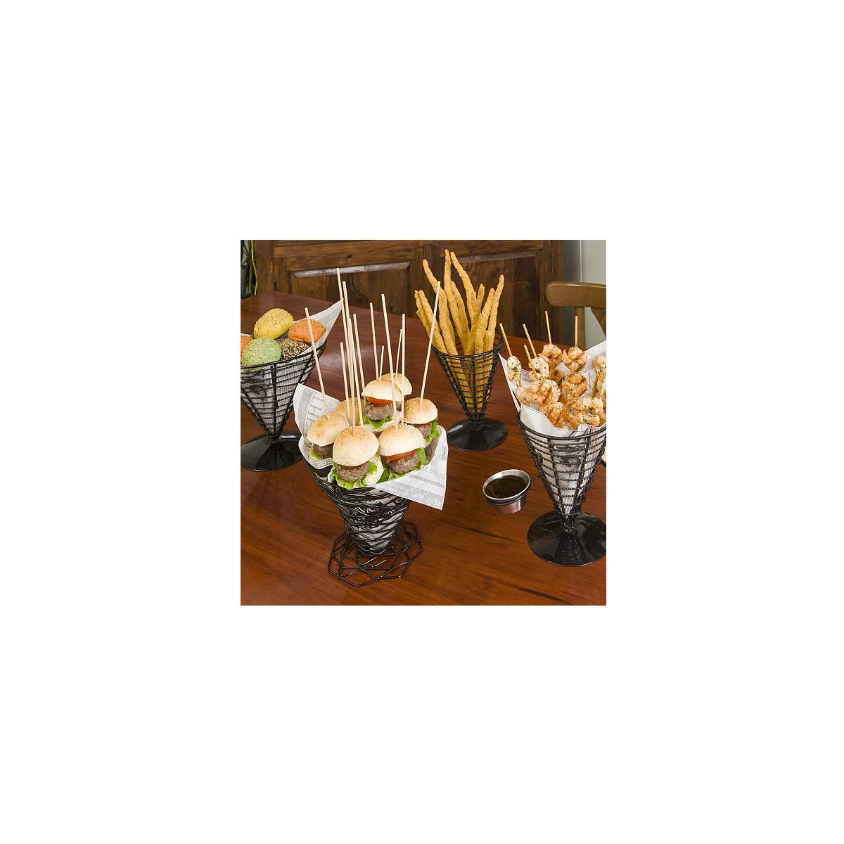 Cesta Cone em Arame de Aço Preto Ø128x180 mm com 2 Copos de Molhos 6 un